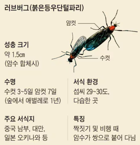 최종환 서울대학교 생명과학부 연구원에 따르면 러브버그가 1934년 중국 장수성 지방에서 처음 발견돼 신종으로 기재가 되었다고 소개했습니다. 1996년 일본 야야마 제도로 건너갔으며 2015년에는 오키나와 본섬에서도 발견이 되었다고 합니다. 우리나라에서는 2018년에 인천에서 국내 최초로 발견이 되었습니다. 당시에는 자료가 부족하여 어떤 경로로 어떻게 유입이 되었는지는 안타깝지만 알 수가 없습니다.