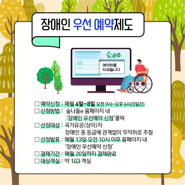 ✅ 장애인복지법,국가유공자,보훈대상자,민주유공자는 관련 법률에 따라 자연휴양림을 우선적으로 이용할 수 있도록 합니다.