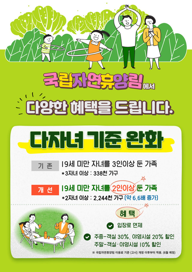 ✅ 다자녀 가구 지원 정책에 따라 19세(이용일 기준) 미만의 자녀 2명 이상을 양육하는 회원이 자연휴양림을 우선적으로 이용할 수 있도록 다자녀우선예약 추첨제를 실시합니다.