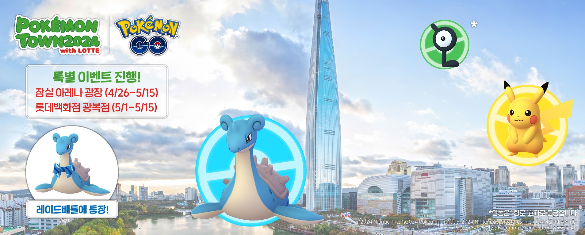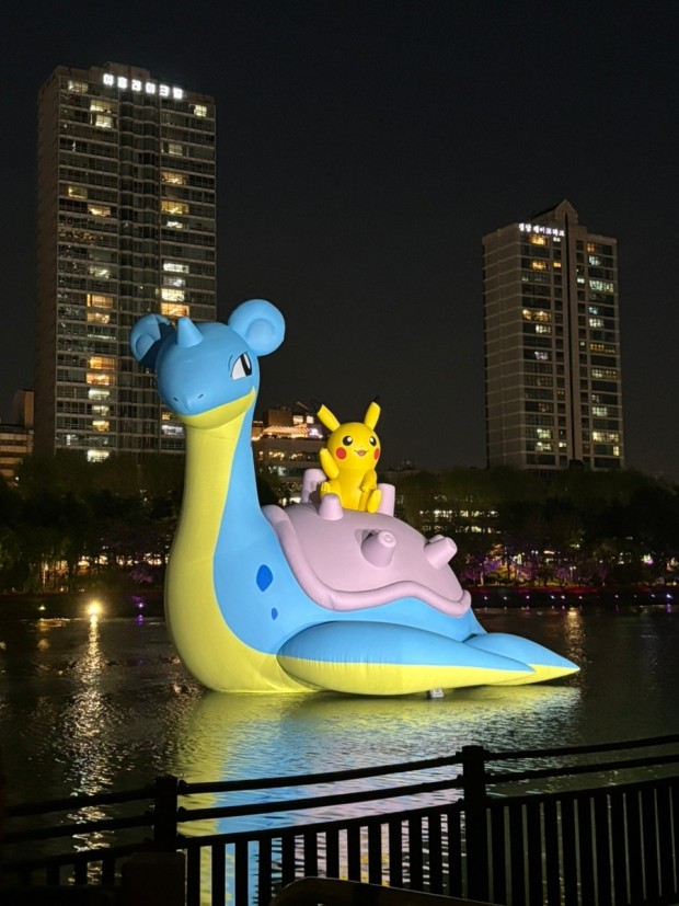 행사 기간 동안 석촌호수 동호에는 약 16m 높이의 거대한 포켓몬 '라프라스'와 '피카추'의 대형 아트 벌룬이 세계 최초로 전시가 됩니다. 등껍질에 사람과 포켓몬을 태우고 바다 건너는 것을 좋아하는 라프라스가 피카츄와 함께 석촌호수에서 포켓몬 팬들을 기다리고 있습니다.